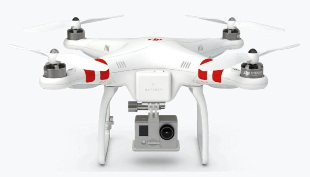 DJI Phantom 1 ohne eingebaute Kamera. Eine GoPro Hero 3 war darunter geschraubt.